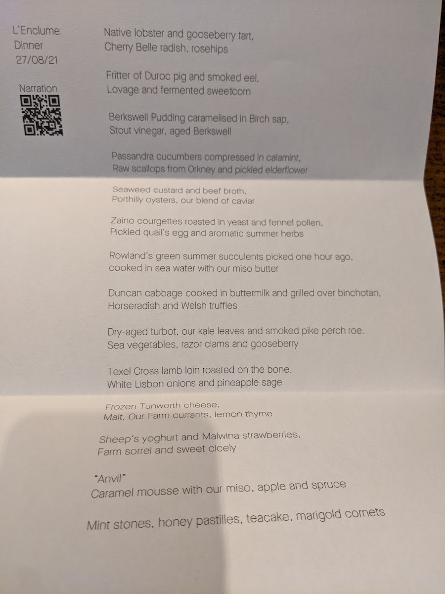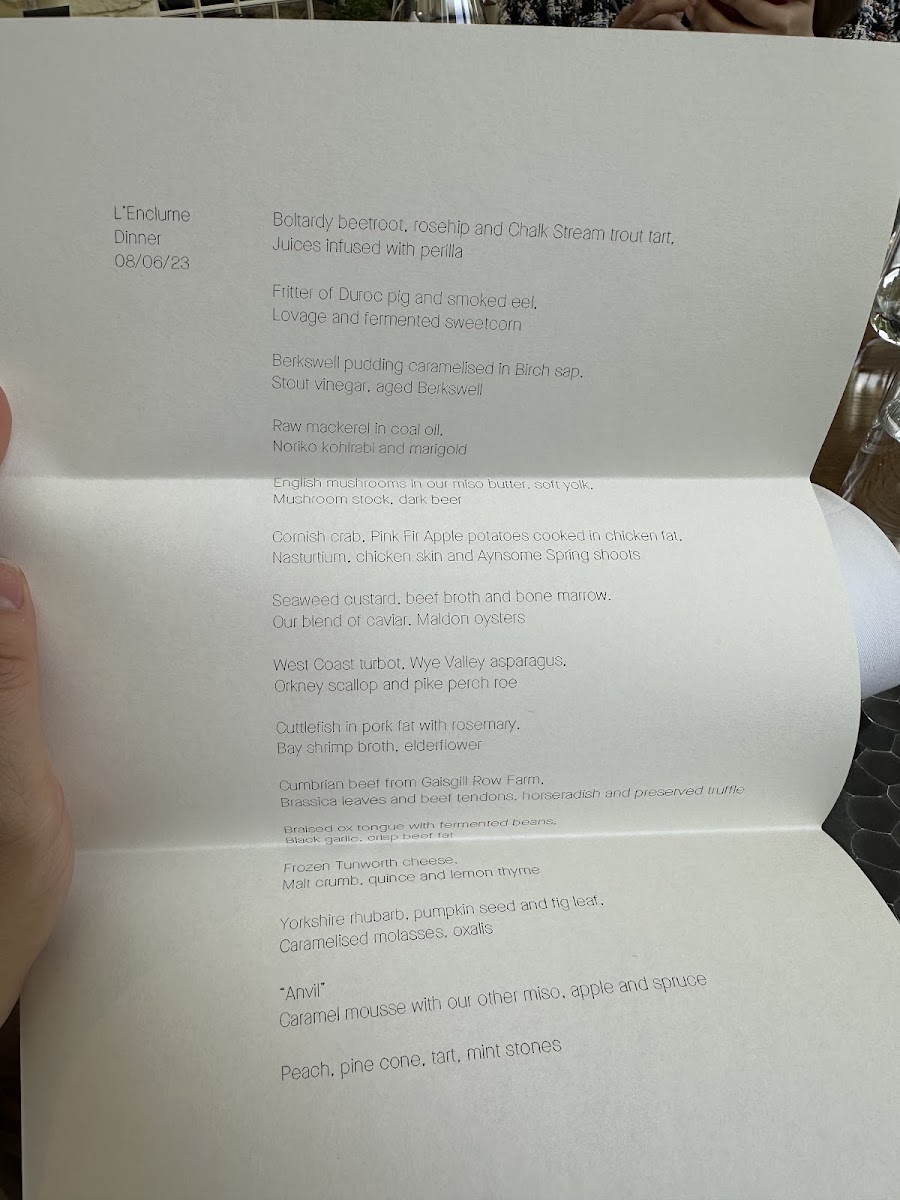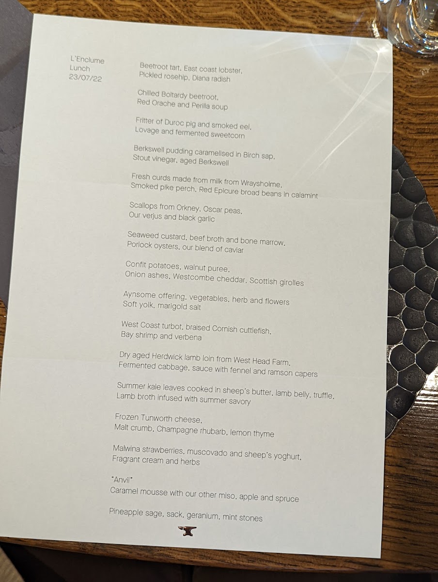 The tasting menu at L'enclume is a journey through flavors, expertly crafted with a focus on modern British cuisine. Signature dishes like the "beetroot, horseradish, and sourdough" offer a delightful balance of earthy flavors, while the "lamb, wild garlic, and foraged herbs" truly exemplify the restaurant's dedication to local produce. The dishes are not just meals but narratives of the seasons, transforming as the year progresses to reflect the ever-changing landscape.